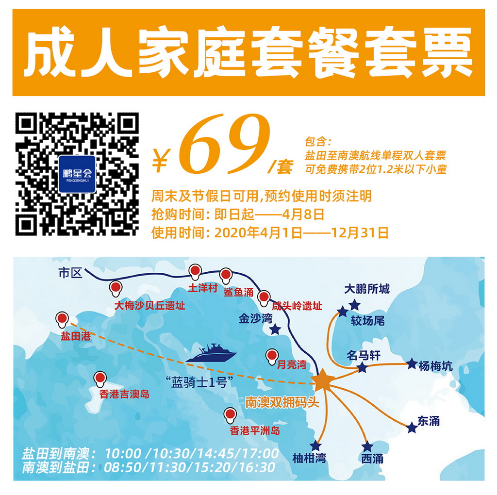 此外,即日起至4月8日,“鵬星會”專門推出69元“鹽田-南澳”航線家庭套票特價套餐搶購活動,套餐包含2位成人(可免費(fèi)攜帶2位身高1.2米以下小童)全航班單程船票,有效期為2020年4月1日至12月31日,周末及節(jié)假日均可使用,市民及旅客朋友可通過“鵬星會”公眾號下單搶購,搶購成功后,在出發(fā)前需至少提前1天以上致電4001020860預(yù)約,該套餐不接受出發(fā)當(dāng)天預(yù)約。