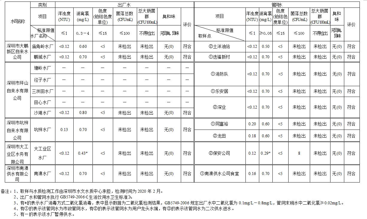 見(jiàn)圳客戶端·深圳新聞網(wǎng)2020年4月4日訊(見(jiàn)圳客戶端、深圳新聞網(wǎng)記者葉梅)2020年2月,深圳市水務(wù)局對(duì)全市42個(gè)水廠出廠水水樣以及68個(gè)管網(wǎng)水水樣進(jìn)行了抽檢。檢測(cè)結(jié)果表明,依據(jù)GB5749—2006《生活飲用水衛(wèi)生標(biāo)準(zhǔn)》,所有受檢42個(gè)出廠水水樣和68個(gè)管網(wǎng)水水樣的渾濁度、消毒劑(游離氯或二氧化氯或總氯)、色度、菌落總數(shù)、總大腸菌群及臭和味共6項(xiàng)常規(guī)指標(biāo)全部符合該標(biāo)準(zhǔn)的規(guī)定,出廠水水樣合格率為100%,管網(wǎng)水合格率為100%。