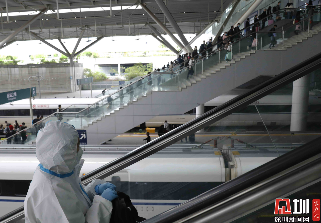 一位身著防護(hù)衣的旅客正在出站。