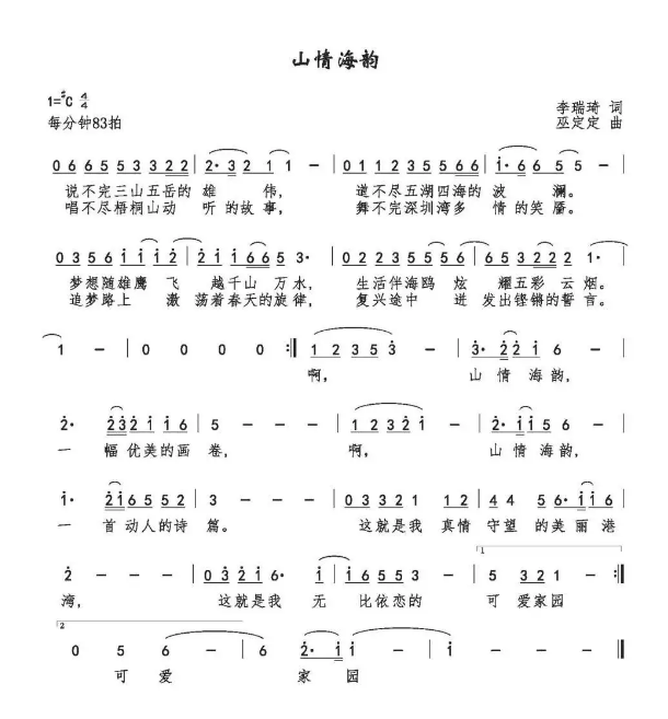 《山情海韻》歌詞大氣,飽含深情。作者以詩一般的語言為我們描繪了一幅幅優(yōu)美多姿的畫面,詮釋了深圳從一個(gè)小漁村發(fā)展成繁華大都市的壯闊景象,展現(xiàn)了年輕一代充滿活力、努力奮斗、只爭朝夕的精神面貌,催人奮進(jìn)。