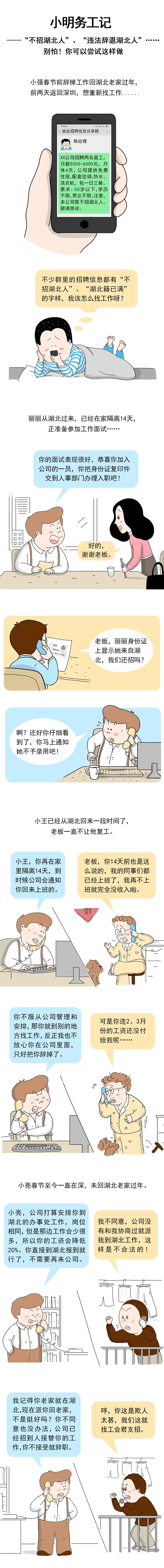 目前,仍有小部分湖北職工在深務(wù)工時(shí)遭到了如漫畫所描繪的就業(yè)歧視,我們要堅(jiān)決反對就業(yè)環(huán)境中歧視湖北人的行為!