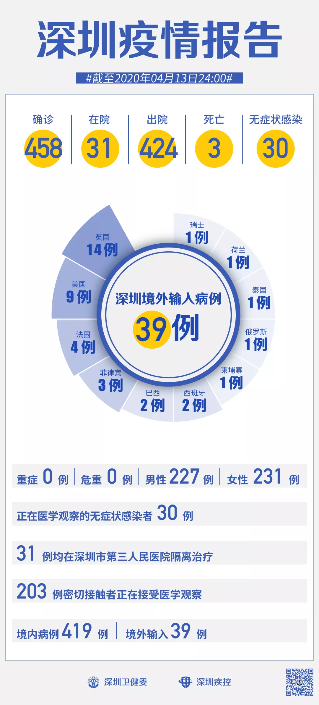 截至4月13日24時,深圳累計報告新冠肺炎病例458例。4月13日當(dāng)天新增2例境外輸入病例,新增無癥狀感染者1例,出院1例。