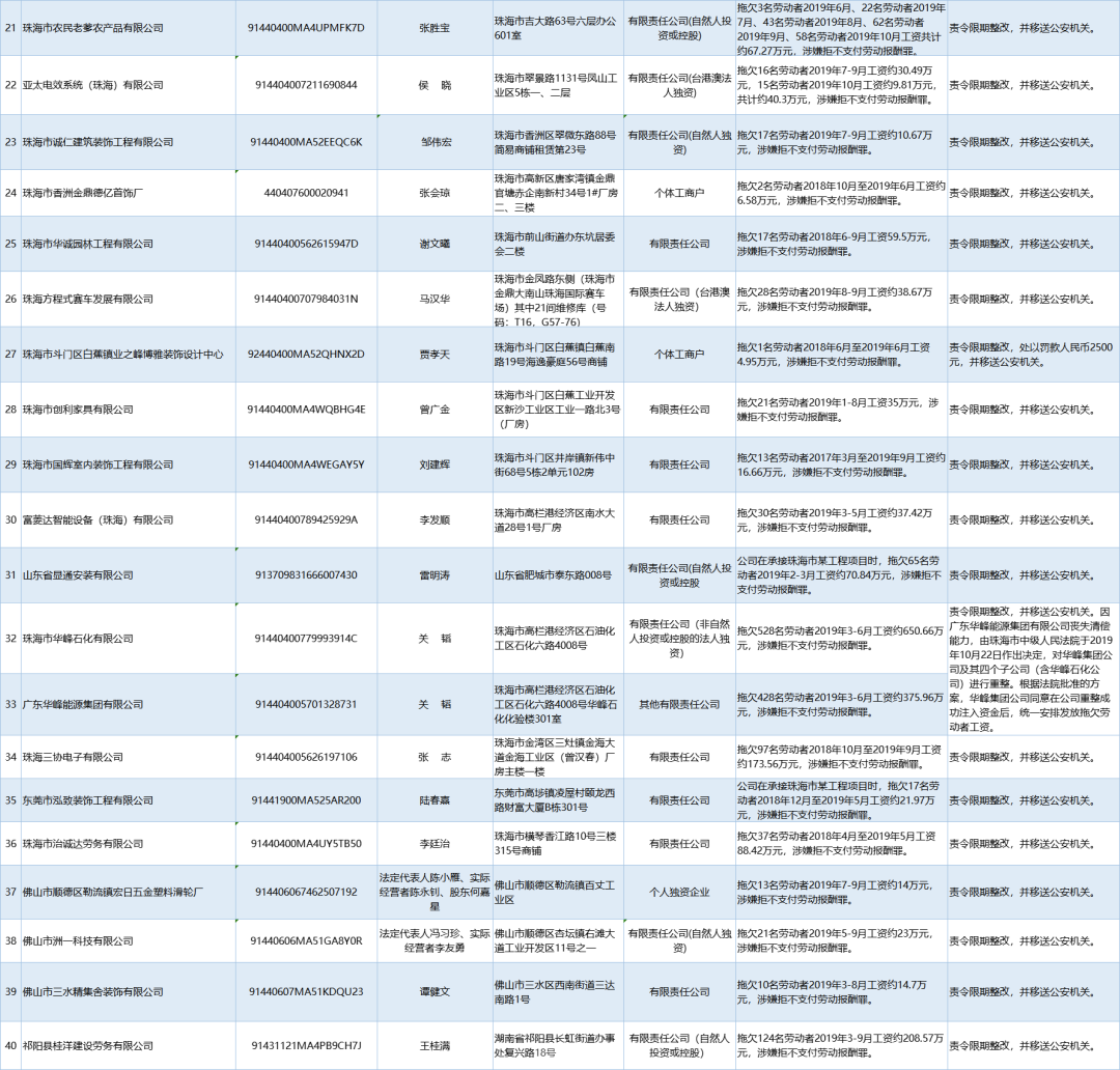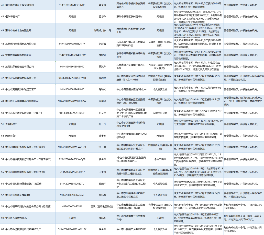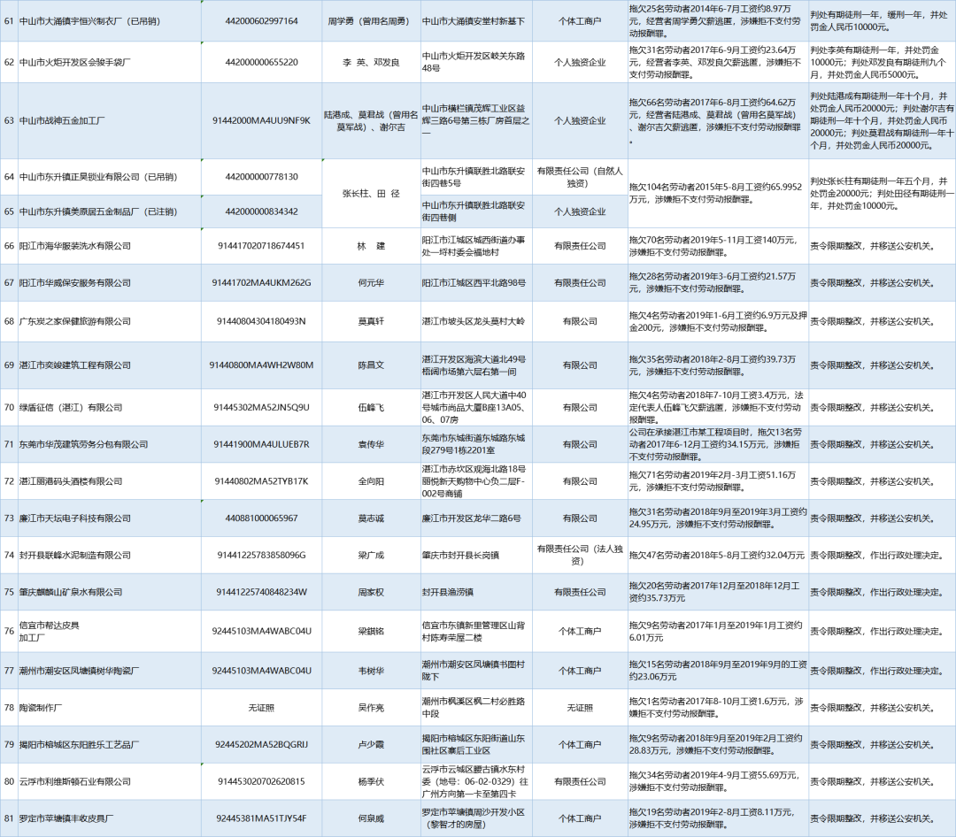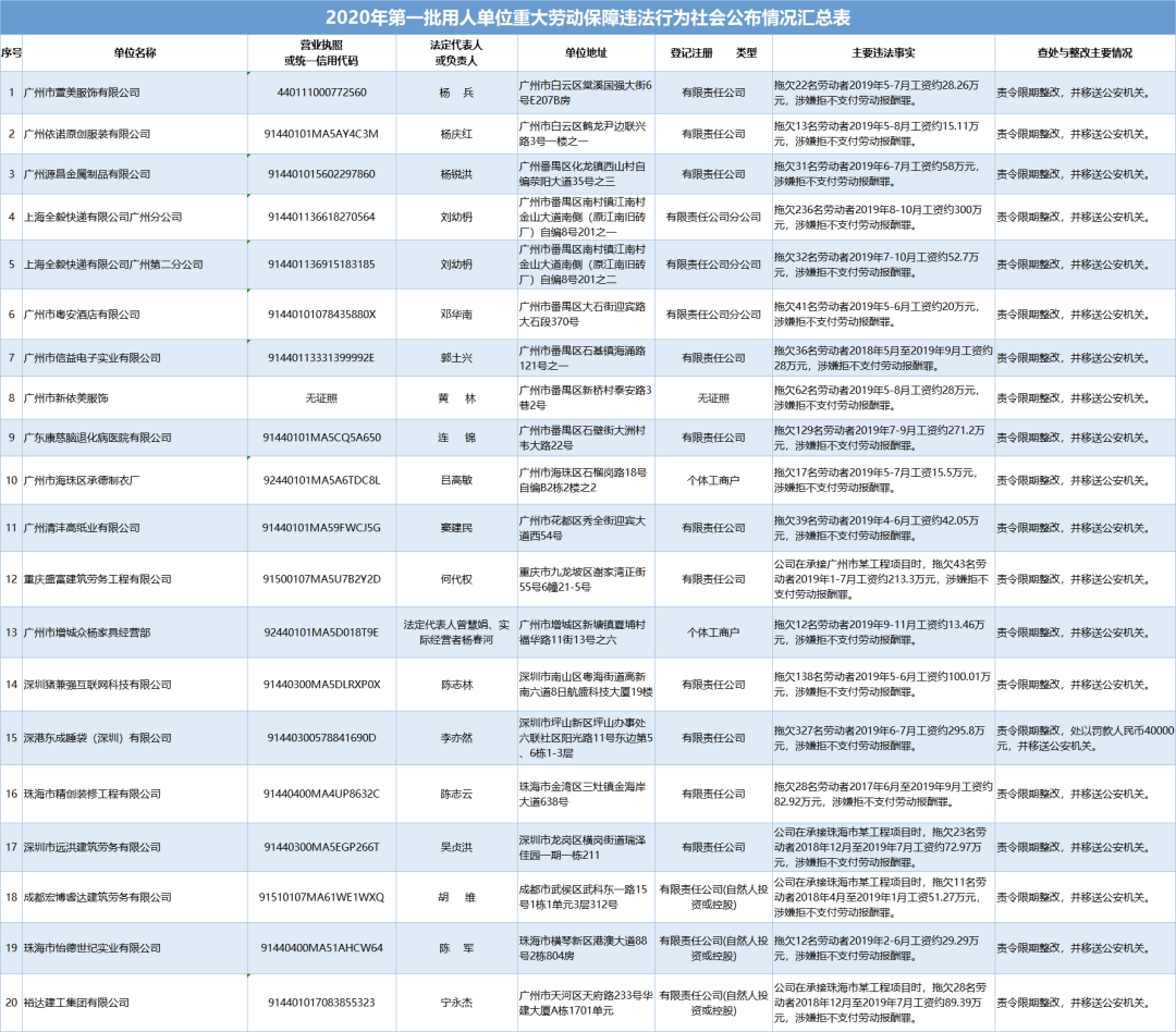 為加強(qiáng)對違法用人單位的社會監(jiān)督,強(qiáng)化誠信體系建設(shè),加大威懾力,依據(jù)《廣東省用人單位重大勞動(dòng)保障違法行為社會公布暫行規(guī)定》,省人社廳公布2020年第一批重大違法案件,涉及81家企業(yè),其中深圳豬兼強(qiáng)互聯(lián)網(wǎng)科技有限公司拖欠138名勞動(dòng)者2019年5-6月工資約100.01萬元,涉嫌拒不支付勞動(dòng)報(bào)酬罪,被責(zé)令限期整改,并移送公安機(jī)關(guān)。深港東成睡袋(深圳)有限公司拖欠327名勞動(dòng)者2019年6-7月工資約295.8萬元,涉嫌拒不支付勞動(dòng)報(bào)酬罪,被責(zé)令限期整改,處以罰款人民幣4萬元,并移送公安機(jī)關(guān)。