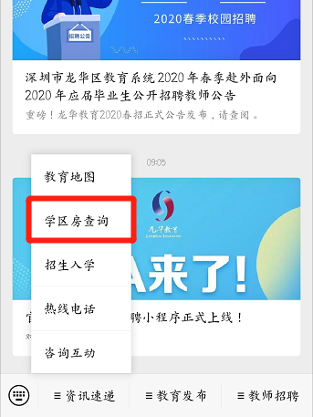 學(xué)區(qū)房鎖定情況可通過“龍華教育”微信公眾號(hào)—“資訊速遞”—“學(xué)區(qū)房查詢”自助查詢。查詢操作如下: