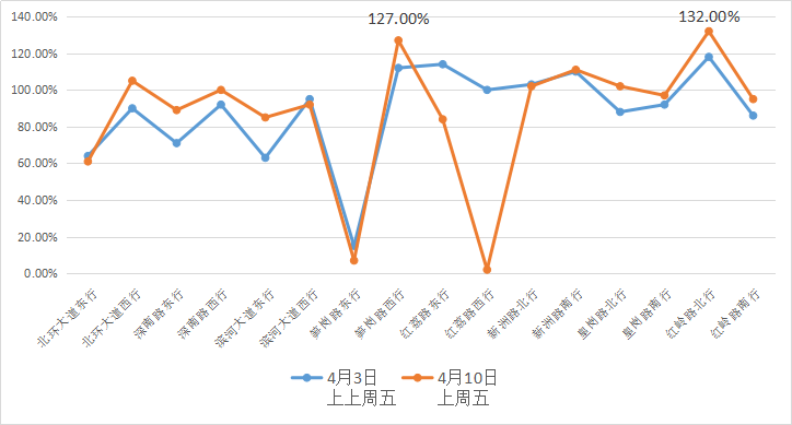 同時(shí),主干道的飽和程度也處于高位。經(jīng)對(duì)上周五和上上周五晚高峰各主干道飽和度情況分析,筍崗路西行和紅嶺路北行飽和度最高,超過120%。預(yù)計(jì)本周五各主干道飽和度,依然維持較高狀態(tài)。