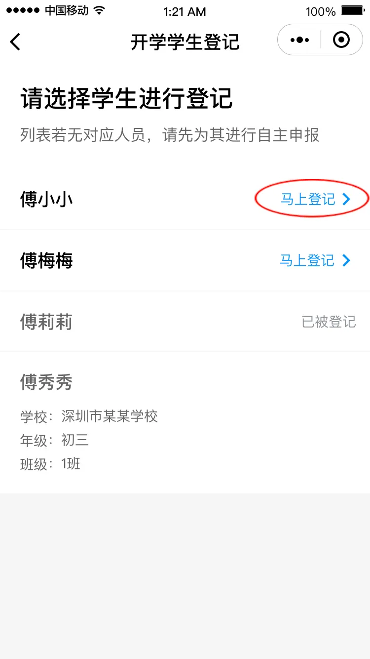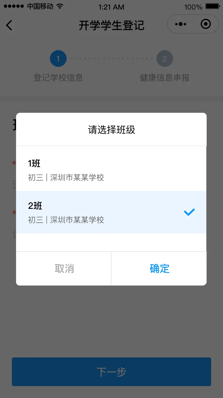 進(jìn)入“開學(xué)學(xué)生登記”頁面,點擊“馬上登記”進(jìn)入登記界面,填寫班主任姓名和手機號碼后點擊“下一步”,請選擇對應(yīng)的班級,進(jìn)入健康申報卡界面。