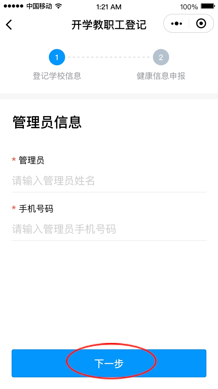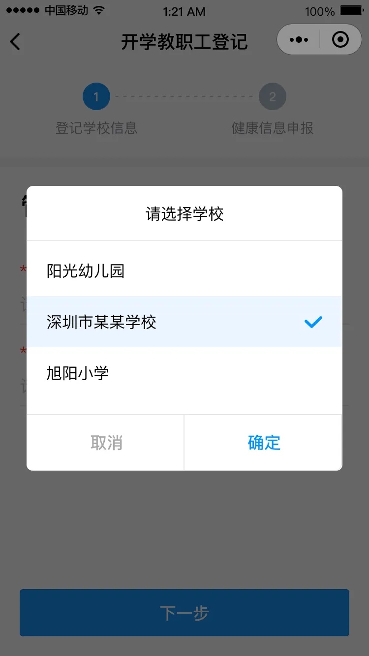 點擊“馬上登記”進(jìn)入登記界面,填寫學(xué)校管理員姓名和手機號碼(學(xué)校管理員姓名和手機號碼請詢問學(xué)校獲得),點擊“下一步”,請選擇對應(yīng)的學(xué)校,進(jìn)入健康申報卡界面。