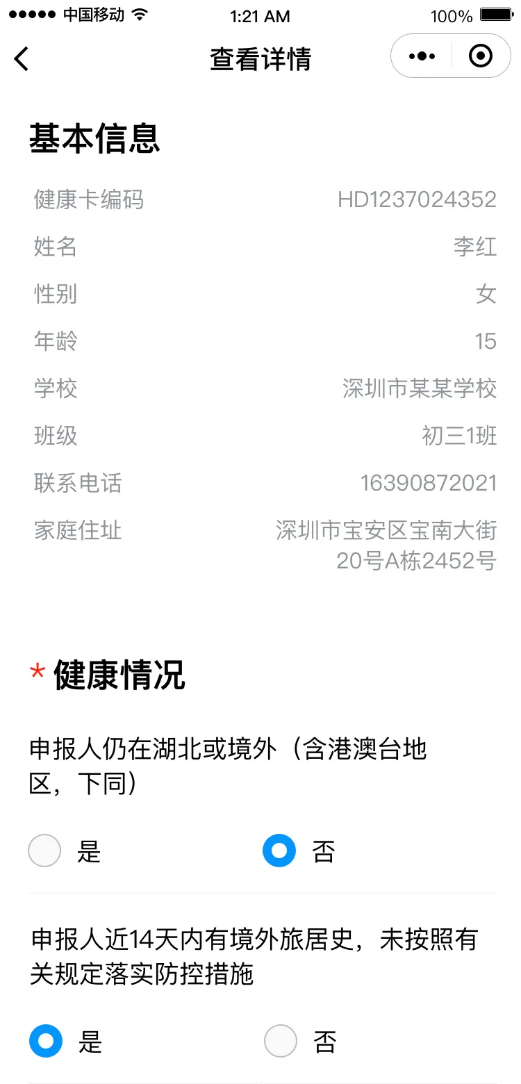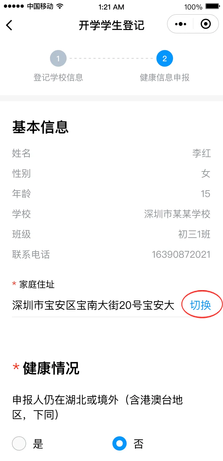 請根據(jù)實際情況完成健康信息申報,包括選擇家庭住址、申報健康情況、填寫監(jiān)護(hù)人姓名。