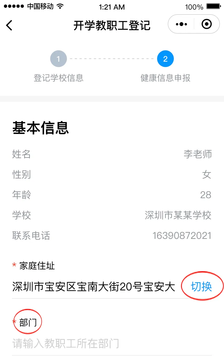 請根據(jù)實(shí)際情況完成健康信息申報,包括選擇家庭住址、填寫所在部門、申報健康情況。