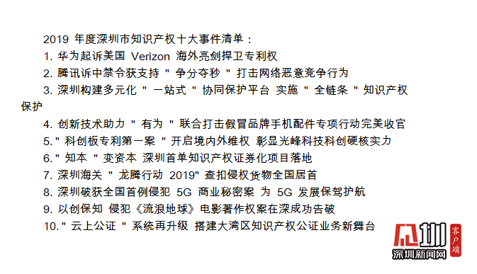 值得關(guān)注的是,在深圳市知識(shí)產(chǎn)權(quán)工作會(huì)議期間,全市2019年度知識(shí)產(chǎn)權(quán)十大事件正式對(duì)外發(fā)布,華為起訴美國(guó)Verizon、騰訊訴中禁令獲支持、“有為”聯(lián)合打擊假冒品牌手機(jī)配件專項(xiàng)行動(dòng)完美收官等事件上榜。