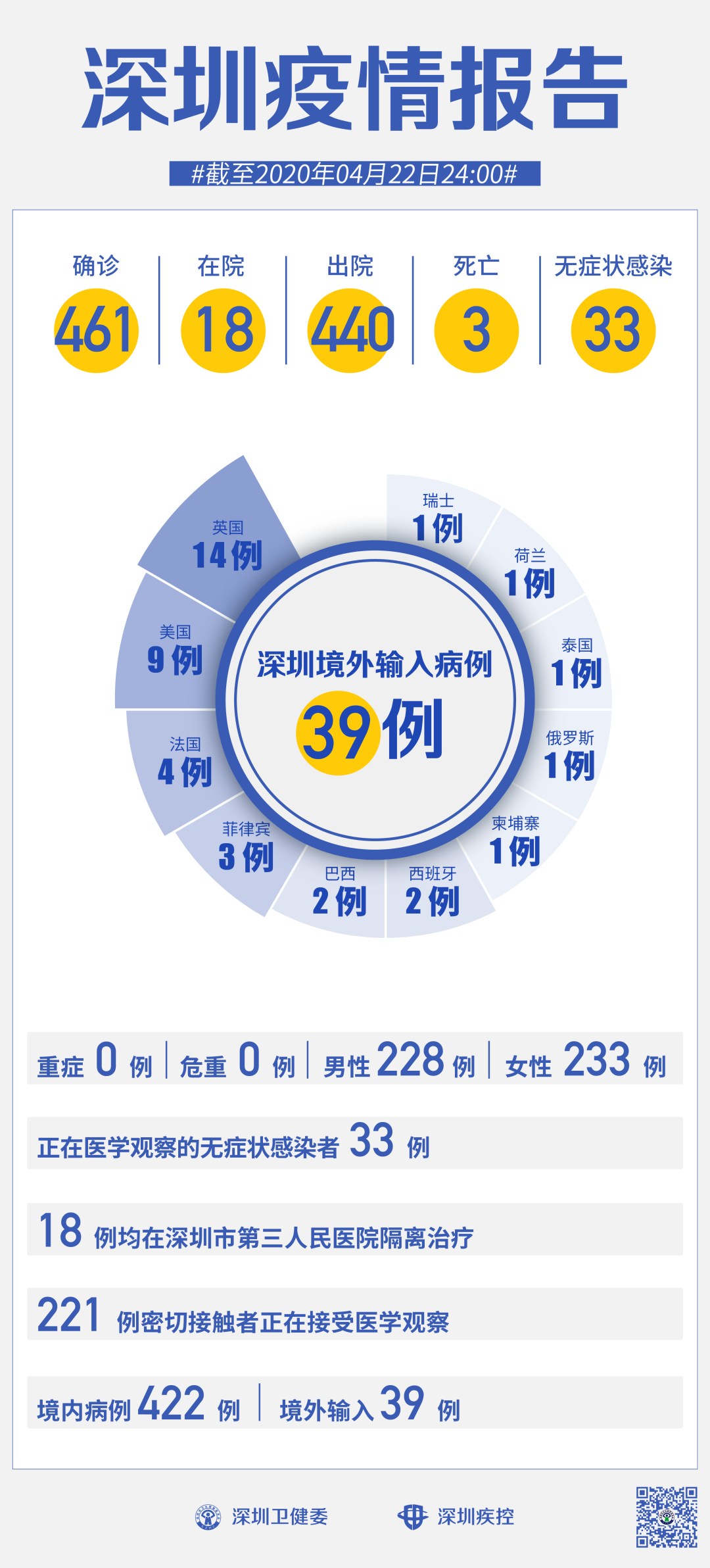 截至4月22日24時(shí),深圳累計(jì)報(bào)告新冠肺炎病例461例。4月22日當(dāng)天新增出院1例。