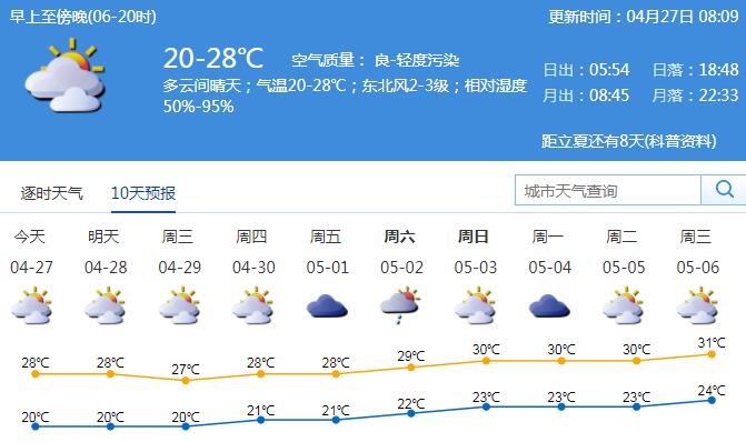 見圳客戶端?深圳新聞網(wǎng)2020年4月27日訊 27日我市多云間晴天,部分時間有輕微-輕度灰霾;氣溫20-28℃;東北風2-3級;相對濕度50%-95%。未來幾天陽光增多,氣溫回升,溫暖干燥;5月1-3日多云間陰天,早晚有輕霧,間中有分散陣雨。
