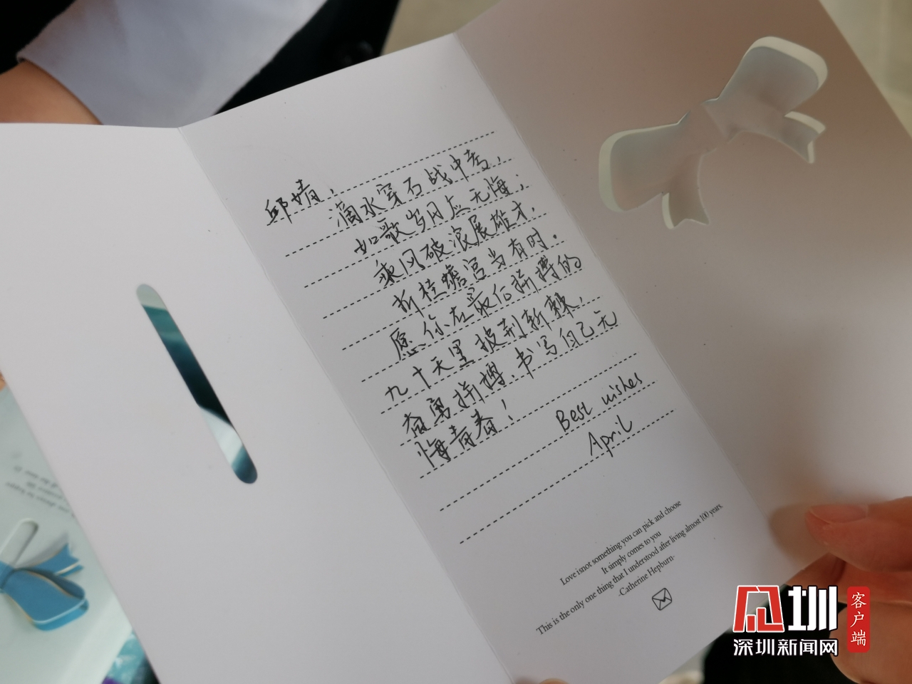 “滴水穿石戰(zhàn)中考,如歌歲月應(yīng)無(wú)悔。乘風(fēng)破浪展雄才,折桂蟾宮當(dāng)有時(shí)。愿你在最后拼搏的九十天里,披荊斬棘,奮勇拼搏,書(shū)寫自己無(wú)悔青春?!边@是龍華區(qū)外國(guó)語(yǔ)學(xué)校邱婧同學(xué)收到的老師親筆手寫的激勵(lì)卡,這些充滿力量的鼓舞詞句表達(dá)了畢業(yè)班園丁們對(duì)學(xué)生們的共同祝福與期盼。
