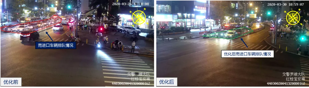 針對此情況,深圳交警對該路口綠信比方案進(jìn)行優(yōu)化調(diào)整,延長西面放行時(shí)間,同時(shí)壓縮北面和東面放行時(shí)間。優(yōu)化后,路口晚高峰持續(xù)時(shí)間縮短17.6%,南進(jìn)口車輛通行效率提升明顯,路口其余方向車輛排隊(duì)無明顯增加。