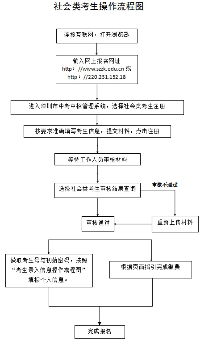 見圳客戶端·深圳新聞網(wǎng)2020年4月30日訊 據(jù)深圳市教育局消息,2020年深圳高中階段學(xué)校招生考試(以下簡稱“中考”)報(bào)名定于5月6日-15日進(jìn)行,考試時(shí)間為7月20日-21日。 今年本市應(yīng)屆初中畢業(yè)生仍繼續(xù)在就讀學(xué)校集體辦理報(bào)名手續(xù)。符合深圳中考報(bào)名條件的深圳戶籍往屆生、在市外就讀的深圳戶籍應(yīng)屆初中畢業(yè)生(以下簡稱“社會類考生”)采用網(wǎng)上報(bào)名方式進(jìn)行報(bào)名。 報(bào)名條件 一、具有我市戶籍的初中畢業(yè)生,可以在我市報(bào)名參加中考。 二、具有我市初三學(xué)籍的隨遷子女可以報(bào)名參加中考,同時(shí)符合以下條件的,可以參加相應(yīng)的公辦普高、民辦普高和中職學(xué)校的劃線錄取。 (一)父親或母親在我市具有合法穩(wěn)定職業(yè); (二)父親或母親在我市具有合法穩(wěn)定住所; (三)父親或母親持有有效《深圳經(jīng)濟(jì)特區(qū)居住證》; (四)父親或母親在我市繳納基本養(yǎng)老保險(xiǎn)及基本醫(yī)療保險(xiǎn),且至少其中一個(gè)險(xiǎn)種累計(jì)繳費(fèi)滿3年,社保累計(jì)年限計(jì)算截至2020年8月31日; (五)隨遷子女在我市具有3年完整初中學(xué)籍。 不符合上述條件但具有我市初中學(xué)籍的隨遷子女,可以在我市參加中考,但僅限于參加民辦普高補(bǔ)錄或中職學(xué)校注冊入學(xué)。 三、高中階段學(xué)校在校生不得報(bào)名。 本市應(yīng)屆初中畢業(yè)生報(bào)名辦法 本市應(yīng)屆初中畢業(yè)生于5月6日至7日在就讀學(xué)校集體辦理報(bào)名手續(xù)。 今年中考繼續(xù)實(shí)行網(wǎng)上報(bào)名。要求各學(xué)校開放計(jì)算機(jī)房,為本校考生上網(wǎng)報(bào)名提供方便。 5月8日至15日,學(xué)校組織考生進(jìn)行電子攝像,學(xué)校和考生分別上網(wǎng)錄入報(bào)名信息,考生錄入信息可參考“考生錄入信息流程圖”進(jìn)行操作。 市教育局強(qiáng)調(diào),學(xué)校不得以任何理由拒絕有本校學(xué)籍的應(yīng)屆畢業(yè)生報(bào)考(參加中職學(xué)校自主招生、注冊入學(xué)的考生,也須報(bào)名參加中考)。如有違反者,將嚴(yán)肅查處,并追究相關(guān)人員責(zé)任。同時(shí)要求各區(qū)有關(guān)職能部門、各有關(guān)學(xué)校(報(bào)名點(diǎn))要嚴(yán)格審查報(bào)名材料。對不符合報(bào)名條件、弄虛作假而被錄取的考生,一經(jīng)發(fā)現(xiàn),取消其錄取資格;已經(jīng)到錄取學(xué)校報(bào)到注冊的,取消其學(xué)籍,并追究相關(guān)人員責(zé)任。 社會類考生報(bào)名辦法 社會類考生采用網(wǎng)上報(bào)名方式進(jìn)行報(bào)名。報(bào)名考生需在5月6日至15日登錄報(bào)名網(wǎng)址(http://www.szzk.edu.cn/),按照提示進(jìn)行網(wǎng)上注冊,上傳報(bào)名審核資料,由考生戶籍所在區(qū)社會報(bào)名點(diǎn)進(jìn)行線上審核,審核通過后系統(tǒng)將生成中考考生號及初始密碼,考生需用獲取的考號及密碼登錄中考中招管理系統(tǒng),填寫個(gè)人信息,具體操作可參考“考生錄入信息流程圖”。同時(shí)需在報(bào)名截止前根據(jù)指引完成網(wǎng)上繳費(fèi)。 若考生網(wǎng)上報(bào)名審核不通過,需按照系統(tǒng)的不通過原因提示,重新補(bǔ)充審核資料,如多次上傳資料失敗或?qū)徍瞬煌ㄟ^,考生可撥打戶籍所在區(qū)的社會報(bào)名點(diǎn)電話進(jìn)行咨詢或電話預(yù)約,按照工作人員指示進(jìn)行操作報(bào)名,不要在未預(yù)約的情況下前往社會報(bào)名點(diǎn),盡量避免出行,減少人員聚集。 社會類考生操作流程如下圖: