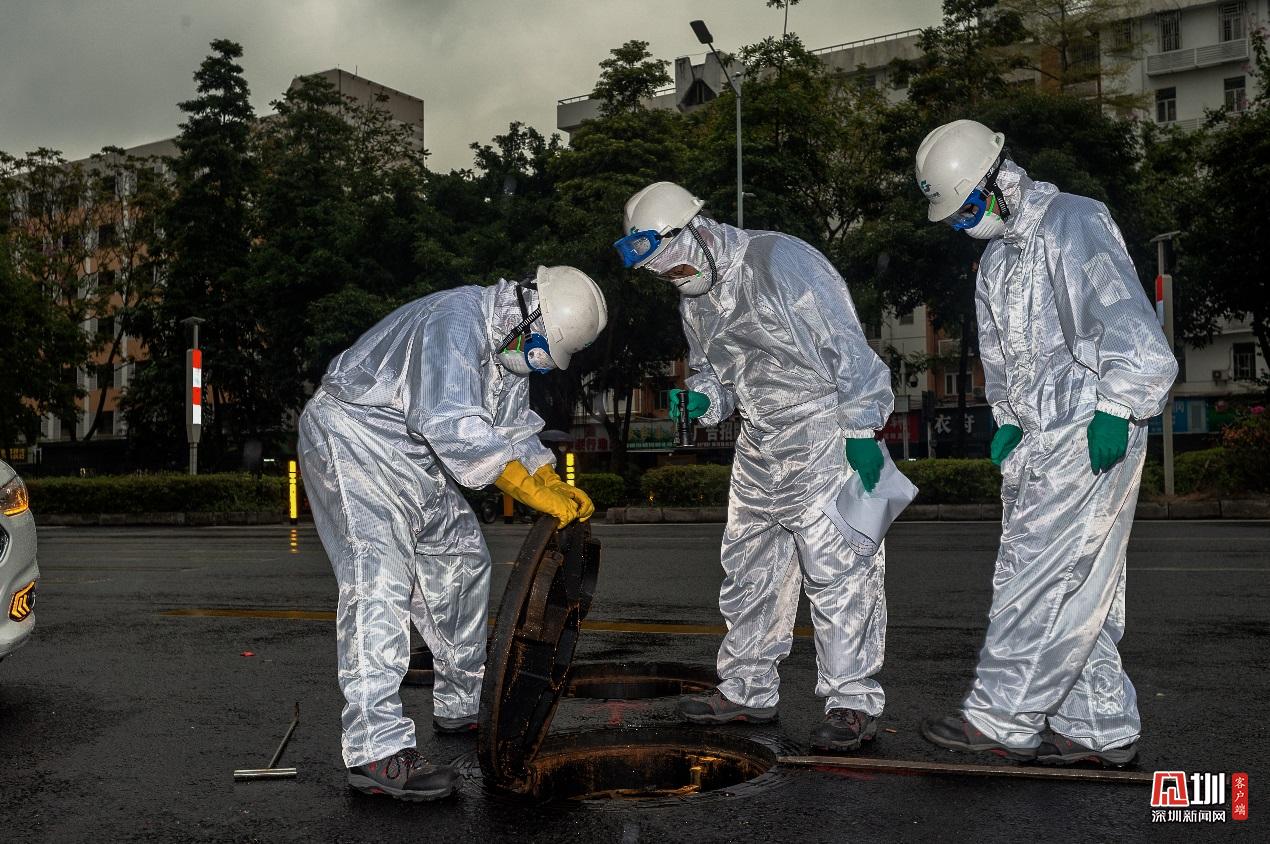 福田分公司巡查工張憶浩、吳暉雄和羅寶斌,正對福中路的排水管網(wǎng)進行細致排查。身后的烏云,與他們白色的防護服形成鮮明對比。