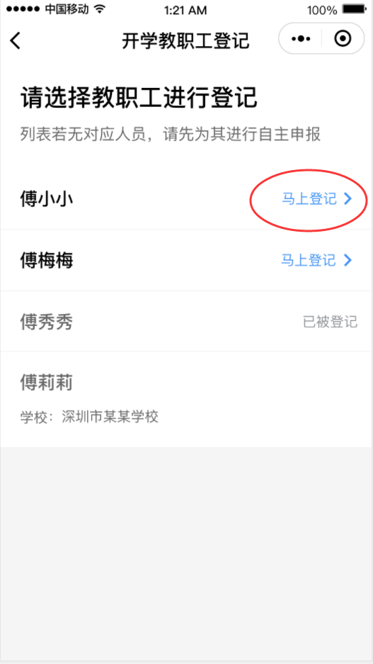 ①在首頁開學專區(qū),點擊“教職工登記”進入申報人員列表,進行自主申報和實名認證。