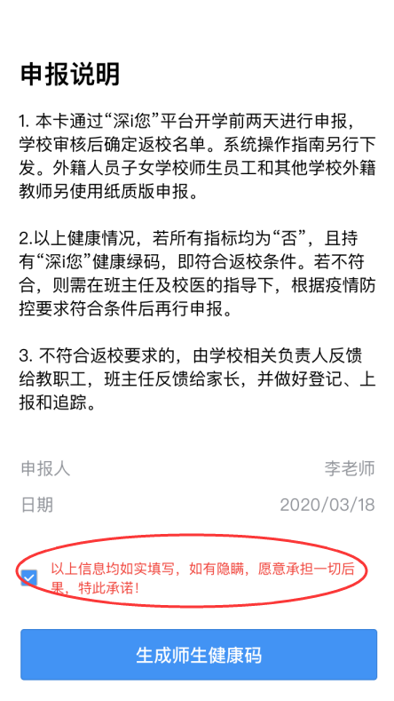 ③完成健康信息申報,包括選擇家庭住址、填寫所在部門、申報健康情況等,請勾選申報承諾,點擊“生成師生健康碼”即可完成健康申報。