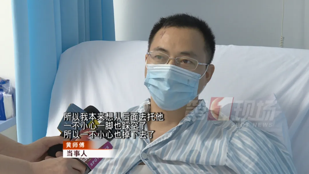 記者在病房見到了救人受傷的黃師傅。他說當時一心只想著救人,忽略了做好安全措施。