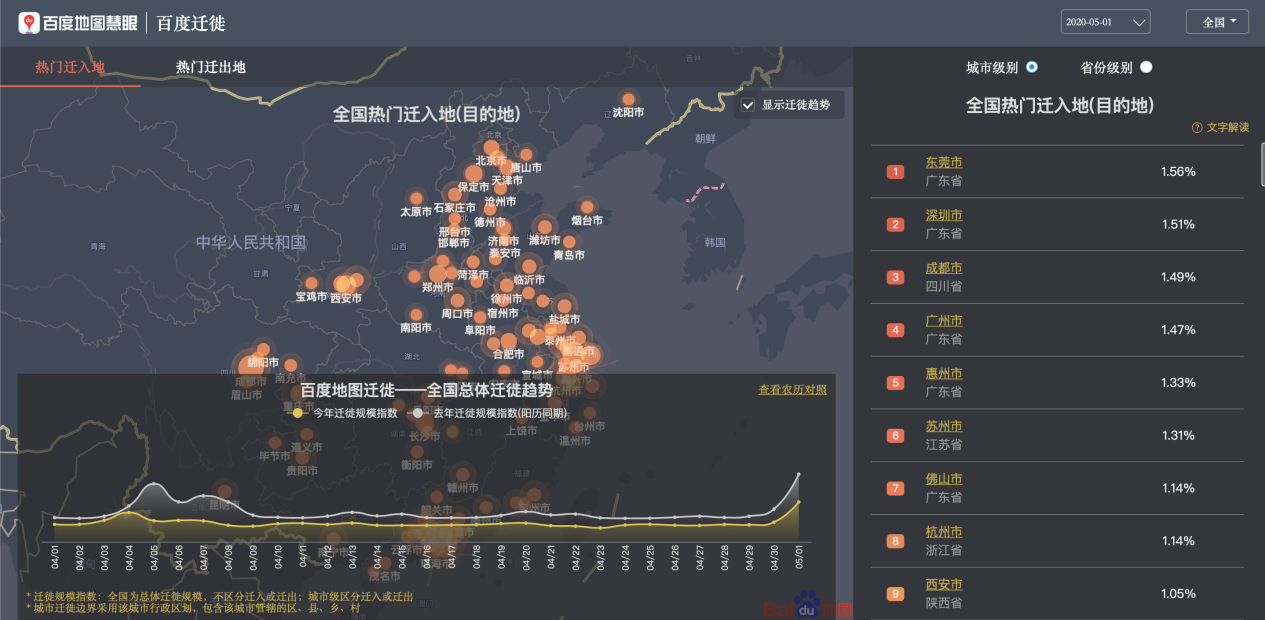 歷經(jīng)3個(gè)月的隔離限制,五一假期的到來(lái)使人們紛紛踏上了歸家相聚、外出散心的旅途。百度地圖遷徙大數(shù)據(jù)平臺(tái)顯示,5月1日全國(guó)總體遷徙規(guī)模較4月30日顯著上升,但仍未達(dá)去年“五一”同期水平。當(dāng)日,全國(guó)熱門遷入地前五依次為:東莞、深圳、成都、廣州、惠州;熱門遷出地前五則為:成都、深圳、廣州、上海、東莞。而在省份維度,熱門遷入、遷出比例最高的省份前三均為廣東、江蘇、四川,廣東以高達(dá)14.22%的遷入比例與16.48%的遷出比例,成為五一首日人口遷徙規(guī)模最大的省份。