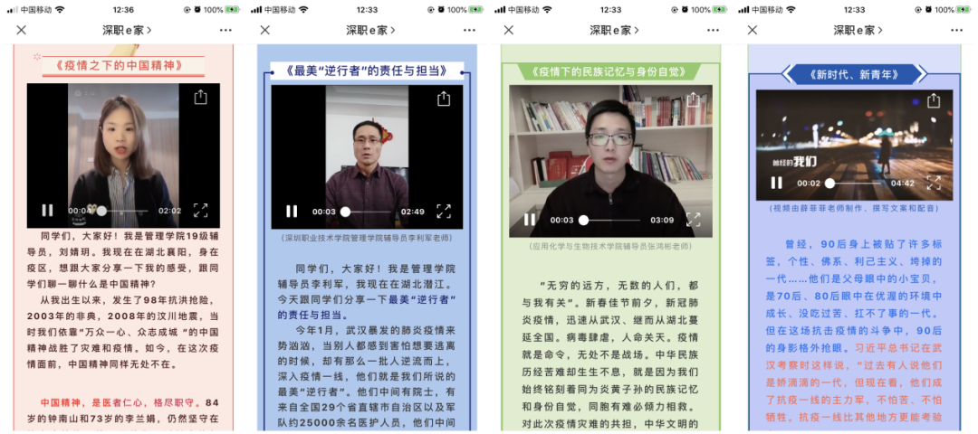 深圳職業(yè)技術(shù)學(xué)院學(xué)生工作部組織33位青年輔導(dǎo)員,推出33講戰(zhàn)“疫情”系列微課程,每天8:30準(zhǔn)時(shí)推送。微課程主題涵蓋愛國主義教育、理想信念教育、生命教育、社會(huì)責(zé)任感教育、感恩教育,不同的主題、不同的視頻、不同的感悟,輔導(dǎo)員老師和同學(xué)們一起在戰(zhàn)“疫”中成長,為同學(xué)們講述每一個(gè)戰(zhàn)“疫”的感人故事。建環(huán)學(xué)院輔導(dǎo)員薛菲菲老師制作精美短視頻、撰寫文案、配樂、配音,以有思想又有溫度的方式與學(xué)生對話。她說,磨煉是成長的催化劑,抗疫是時(shí)代給予的成人禮,經(jīng)此一役,中國的年輕人們對責(zé)任和奉獻(xiàn)的感受更加直觀,對勇敢和擔(dān)當(dāng)?shù)睦斫飧由羁?,而中國,也因?yàn)?0后,收獲了青春洋溢的蓬勃力量!