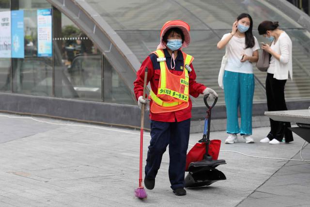 ▲保潔員戴著遮陽帽在街頭忙碌。