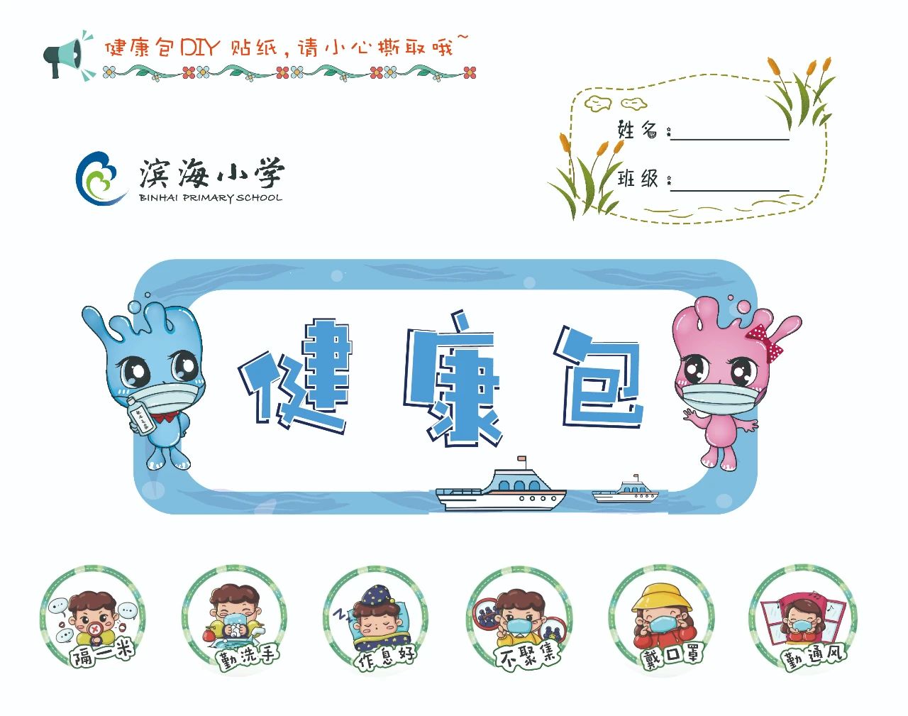 《健康包》,也是學校精心為返校的學生準備的一份健康防疫小禮包,里面有臂貼、DIY貼紙等!這些萌萌的DIY貼紙,可以根據(jù)孩子們的個性需求和遵守情況,自由拼貼!學校通過這些充滿童趣的設(shè)計,讓孩子們將防護措施牢記于心!