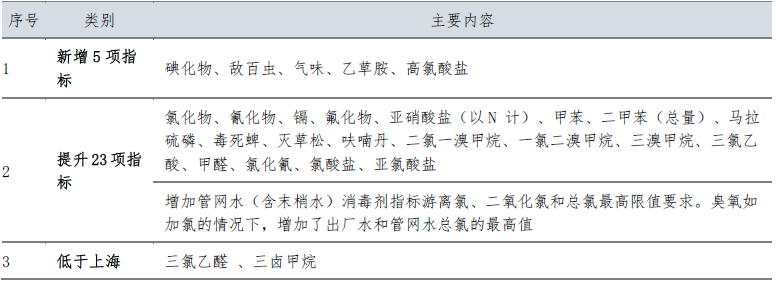 深圳市《生活飲用水水質(zhì)標(biāo)準(zhǔn)》與上海標(biāo)準(zhǔn)相比,增加了5項(xiàng)指標(biāo),提升了23項(xiàng)指標(biāo)(含消毒劑);附錄增加了18項(xiàng)指標(biāo),考核方法上提升了出廠水和管網(wǎng)水合格率要求,增加了嗅味物質(zhì)檢測(cè),重點(diǎn)關(guān)注龍頭水水質(zhì)。