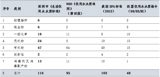 表1、深圳市生活飲用水水質(zhì)標(biāo)準(zhǔn)與其他的標(biāo)準(zhǔn)的比較