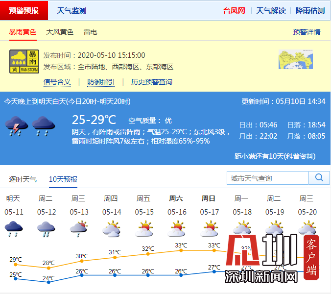 見圳客戶端·深圳新聞網(wǎng)2020年05月10日訊 在外面的朋友們注意了,大風大雨馬上到貨!據(jù)深圳市氣象臺消息,深圳市氣象臺于2020年05月10日15時15分在全市發(fā)布暴雨黃色、大風藍色預警,預計16-17時全市自西北向東南將出現(xiàn)20-40毫米降水,并伴有8級左右短時大風。
