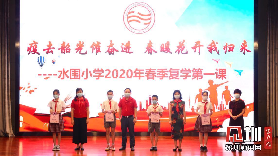 疫情期間,水圍小學“停課不停學,停課不停教”,進行了為期三個月的線上教學。在線上學習的這段時間里,學校涌現(xiàn)了一批在德智體美勞各方面表現(xiàn)優(yōu)異的同學,他們被評為水圍小學“紅領巾十星”,區(qū)教科院李楠、衛(wèi)生健康副校長明昭、校長劉銳娟、校長李月琴副與副校長楊禹清在此次“復課典禮”中為獲獎學生代表頒獎,并在典禮的最后,為在場的學生代表發(fā)放了暖心包。