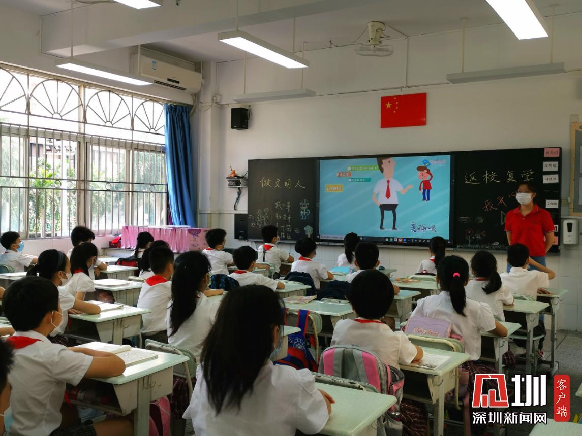 據悉,水圍小學“復學典禮”上午8:40正式開始,出席的嘉賓有福田區(qū)教科院教研員、少先隊總輔導員李楠、衛(wèi)生健康副校長明昭。各班級的學生則帶著口罩,單人單桌在教室內,以觀看直播的方式參加典禮。