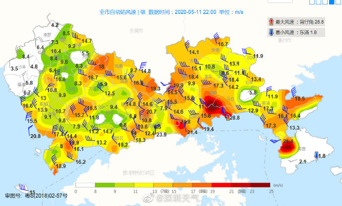22時18分:過去1小時深圳市最大陣風(fēng)達到10-11級,出現(xiàn)在鹽田和大鵬南澳地區(qū)。