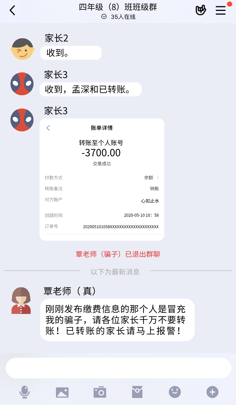 騙子在收款后立即退群,等真老師上線后,被騙父母醒悟過(guò)來(lái)后,騙子已經(jīng)逃之夭夭。
