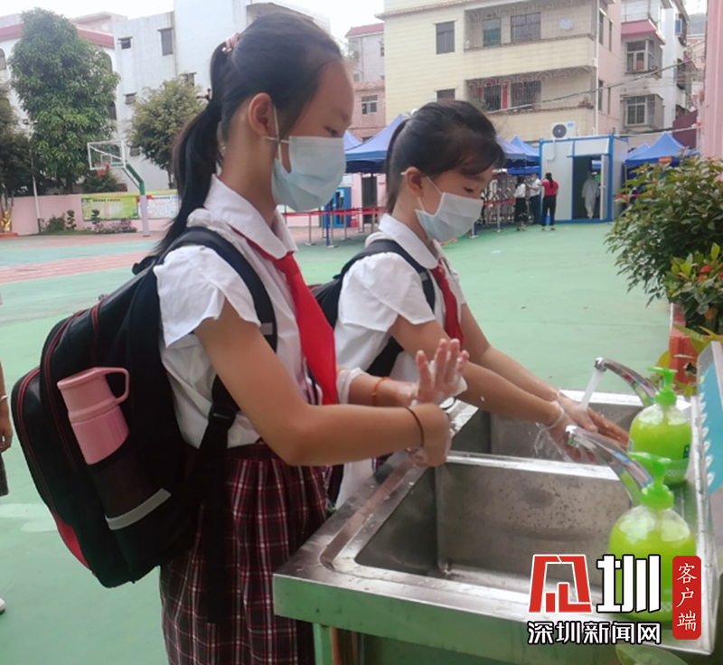 陽(yáng)光小學(xué)學(xué)生進(jìn)校園在洗手臺(tái)洗手