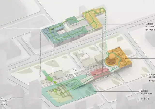 產(chǎn)業(yè)生態(tài)雨林的三個(gè)層級(jí)都可經(jīng)由一個(gè)城市公園的多層級(jí)通道系統(tǒng)抵達(dá),仿佛曲折蜿蜒的河水流過緩坡。