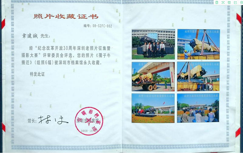 “一開始,我提出這個(gè)遷移建議時(shí),還是有點(diǎn)忐忑的,后來得知‘孺子牛’雕塑將移至市委大院外后,我非常高興,這樣一來,跟‘孺子?!嫌熬头奖愣嗔搜剑 薄叭孀优!钡袼苓w移當(dāng)天,韋建誠興奮地拿起相機(jī),用鏡頭定格下整個(gè)搬遷過程?!澳且惶焓俏胰松铍y忘的日子之一,既是我44歲生日,又是‘孺子?!袼馨残录抑??!被貞浧甬?dāng)時(shí)的情況,韋建誠還是十分興奮。而韋建誠拍攝的組照后來被深圳市檔案館永久收藏。深圳市委辦公廳還將《市民希望將“孺子?!钡袼芤浦潦懈笤和狻吩u(píng)為一等獎(jiǎng)。