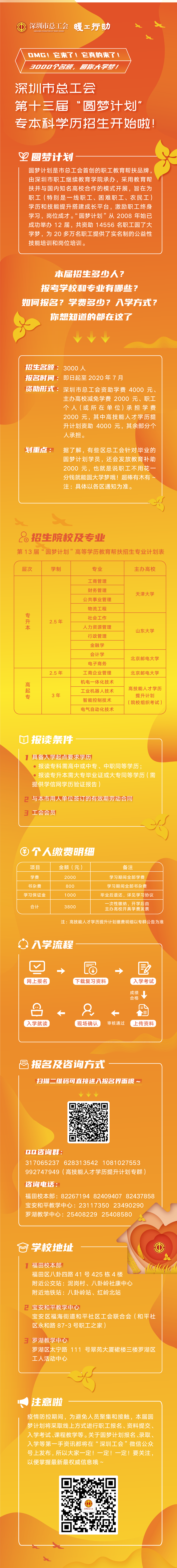 在疫情防控、復(fù)工復(fù)產(chǎn)的特殊形勢下,結(jié)合市總工會“暖工行動”相關(guān)要求,本屆“圓夢計劃”進一步提高幫扶精準(zhǔn)性,向受疫情影響嚴(yán)重的企業(yè)和職工傾斜,推動企業(yè)和職工共擔(dān)責(zé)任、共克時艱,穩(wěn)定職工隊伍和就業(yè),努力做到職工多轉(zhuǎn)崗、少下崗、多就業(yè)、少失業(yè)。符合報名條件的職工可在“深圳工會”微信公眾號上進行報名,報名截止日期為7月30日,主辦方將根據(jù)報名人數(shù)分期分批組織入學(xué)考試。入學(xué)考試采用“文化素養(yǎng)+職業(yè)技能+工作實績”的多元評價方式,在“文化素養(yǎng)”為主體考試中增加工會基本知識,提高職工工會意識。所有錄取學(xué)員將于今年9月入學(xué)就讀,進行線上線下相結(jié)合的學(xué)習(xí),在規(guī)定學(xué)制內(nèi)修滿學(xué)分將獲得各高校頒發(fā)、國家承認(rèn)的畢業(yè)證書。