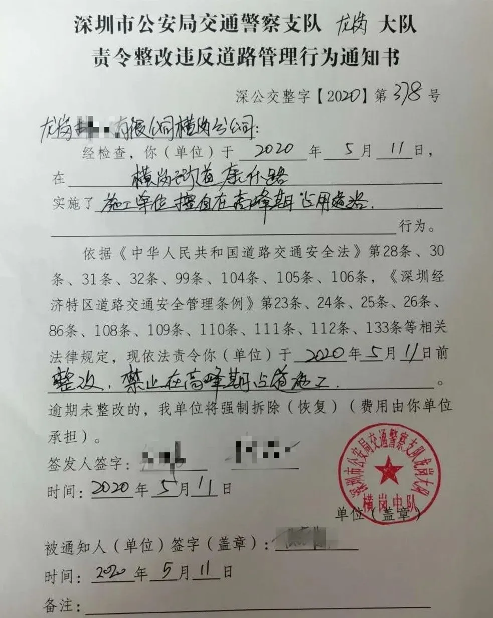 5月12日,執(zhí)勤民警對中鐵**局在馬蹄山村路段占道施工時設(shè)置圍擋沒有放置安全警示燈的違法行為開具整改通知書,責(zé)令立即整改。