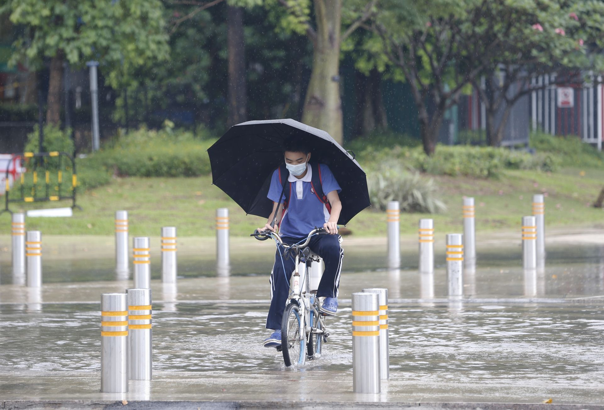 2020年5月26日中午13:27分,香梅路與紅荔西路交界處人行橫道,一名學(xué)生騎車(chē)小心翼翼經(jīng)過(guò)。