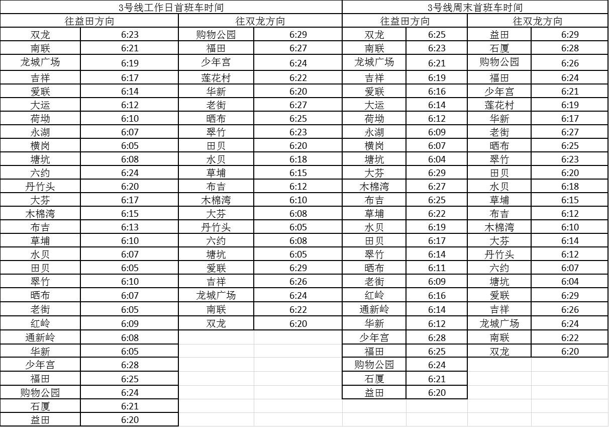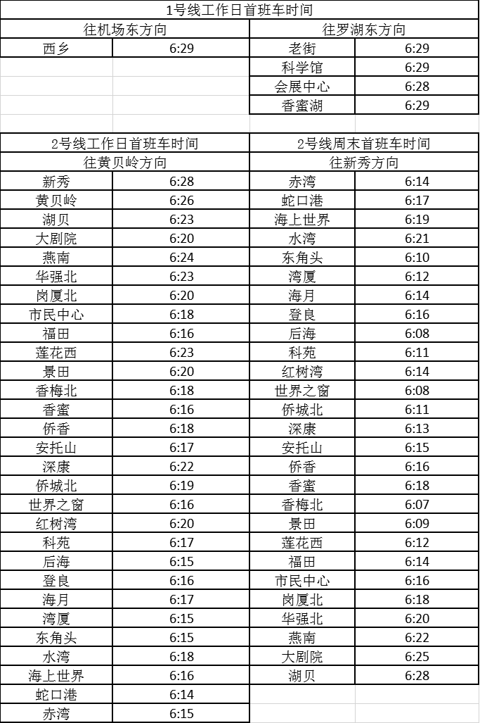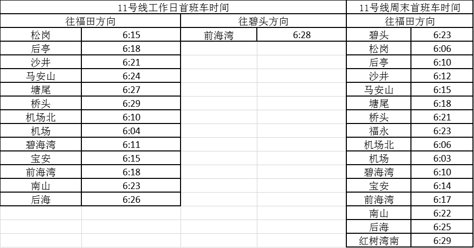 記者獲悉,經(jīng)優(yōu)化調(diào)整后,各線路工作日首班車最早發(fā)車站點及時間分別為,1號線老街站6:29、2號線蛇口港站6:14、3號線塘坑站6:05、5號線坂田站6:01、7號線赤尾6:09、9號線銀湖6:05、11號線機場站6:04。周末期間首班車最早發(fā)車站點及時間分別為,2號線香梅北站6:07、3號線塘坑站6:04、5號線長嶺陂站6:00、7號線皇崗口岸站6:09、9號線孖嶺站6:05、11號線機場站6:03。