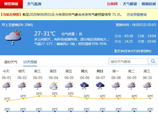 深圳市氣象臺(tái)預(yù)報(bào),未來(lái)一周我市天氣仍不穩(wěn)定,雷雨多發(fā)。6月1日至5日,多云有陣雨或雷陣雨,局地雨勢(shì)較大,天氣漸趨悶熱。目前我市處于龍舟水降水多發(fā)季節(jié),需特別關(guān)注降雨給交通帶來(lái)的影響。請(qǐng)市民及時(shí)關(guān)注市氣象臺(tái)發(fā)布的最新氣象監(jiān)測(cè)預(yù)報(bào)和預(yù)警信息。
