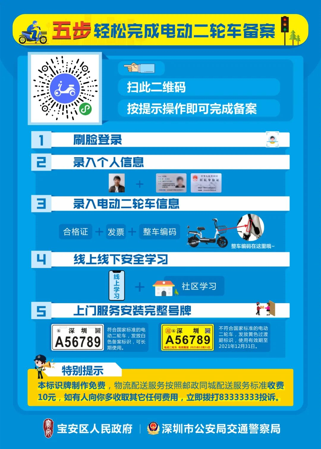 見(jiàn)圳客戶端·深圳新聞網(wǎng)2020年6月2日訊(見(jiàn)圳客戶端、深圳新聞網(wǎng)記者 鄭曉鵬)近日,網(wǎng)上流傳著這樣一張圖片,圖片上稱,6月1日起寶安、光明電動(dòng)二輪車備案通道要關(guān)閉了。消息一出,便引起網(wǎng)友的廣泛關(guān)注“真的假的?”“那我的電動(dòng)車還能上牌嗎?”“超標(biāo)車是什么車?合標(biāo)車又是什么車?”……記者從深圳市交警局獲悉,6月15日起,寶安區(qū)和光明區(qū)超標(biāo)的電動(dòng)二輪車將不再予以發(fā)放黃色過(guò)渡期標(biāo)識(shí);對(duì)于符合新國(guó)標(biāo)標(biāo)準(zhǔn)的車輛,市民持深圳戶籍身份證或居住證即可辦理電動(dòng)二輪車備案,發(fā)放可長(zhǎng)期使用的白色標(biāo)識(shí)。已備案的并發(fā)放黃牌標(biāo)識(shí)的車輛仍可繼續(xù)使用,過(guò)渡期至2021年12月31日。