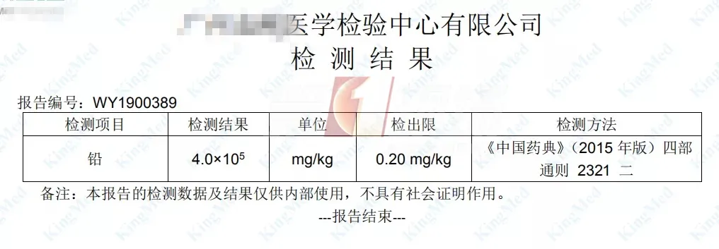 聽了醫(yī)生的建議,孩子家長(zhǎng)將瓶子里的粉末拿到第三方檢測(cè)公司檢測(cè)。結(jié)果顯示,1克的藥粉里面,就含有大概0.4克的鉛!