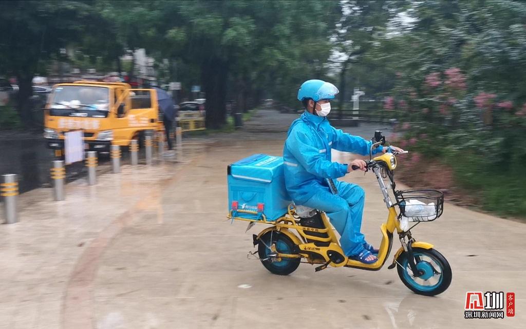 外賣員雨中送外賣的路上。