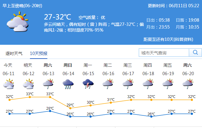 市氣象臺預(yù)測,11-13日多云到晴天,偶有局地短時(雷)陣雨,天氣悶熱,11日氣溫27-32℃;展望14-15日有一次降雨過程。