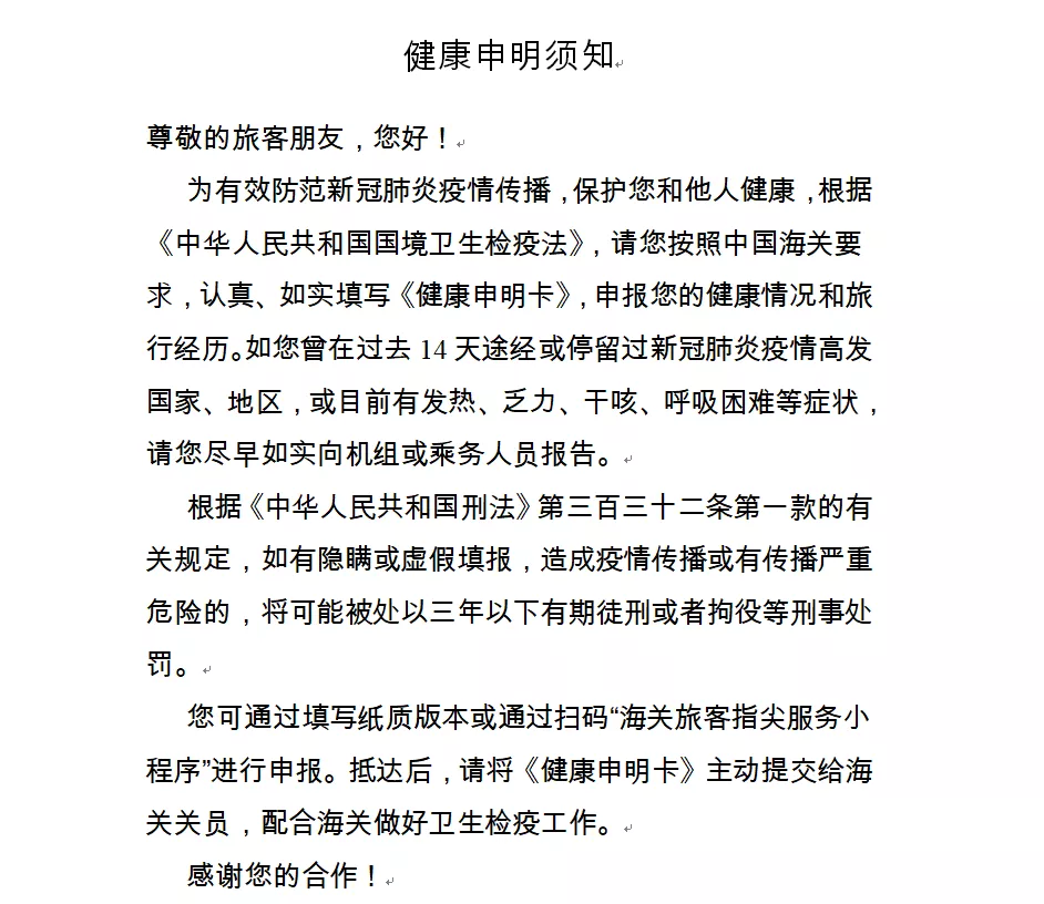 一、請?zhí)崆跋螺d打印《健康申明卡》(見附件1),或關(guān)注“海關(guān)旅客指尖服務(wù)小程序”(見附件2)。提前如實(shí)填寫紙質(zhì)或電子健康申報(bào)信息,通關(guān)時(shí)主動(dòng)向海關(guān)申報(bào)。