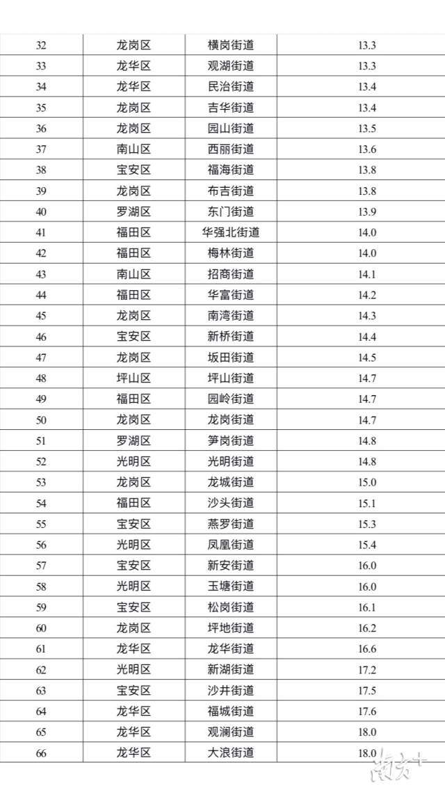 排名前十的街道是:海山、福保、桃源、南澳、葵涌、蓮塘、石巖、西鄉(xiāng)、蓮花和黃貝等街道;排名倒數(shù)前十的是:公明、馬田、龍?zhí)?、大浪、觀(guān)瀾、福城、沙井、新湖、龍華和坪地等街道。