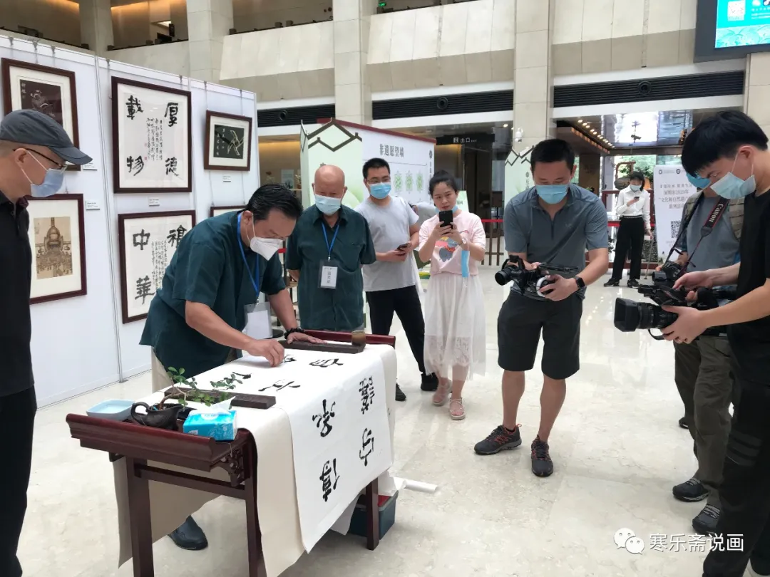 王和平在活動(dòng)現(xiàn)場(chǎng)揮指書(shū)寫(xiě)“傳承文化瑰寶,守護(hù)自然之家”并接受主持人采訪。