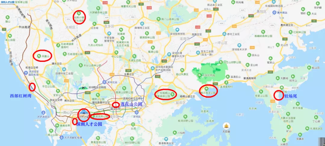 深圳灣公園、西灣紅樹(shù)林公園、蓮花山公園、深圳人才公園、世界之窗、光明小鎮(zhèn)花海、鳳凰山森林公園、梧桐山風(fēng)景名勝區(qū)和大、小梅沙海濱公園。